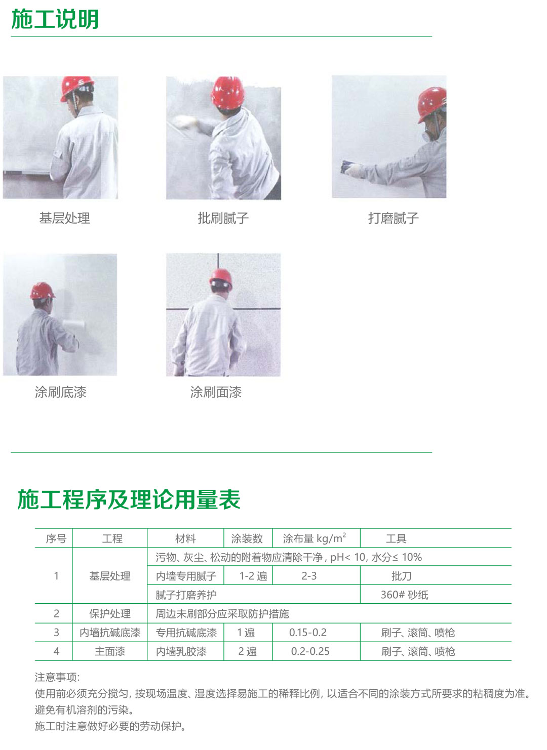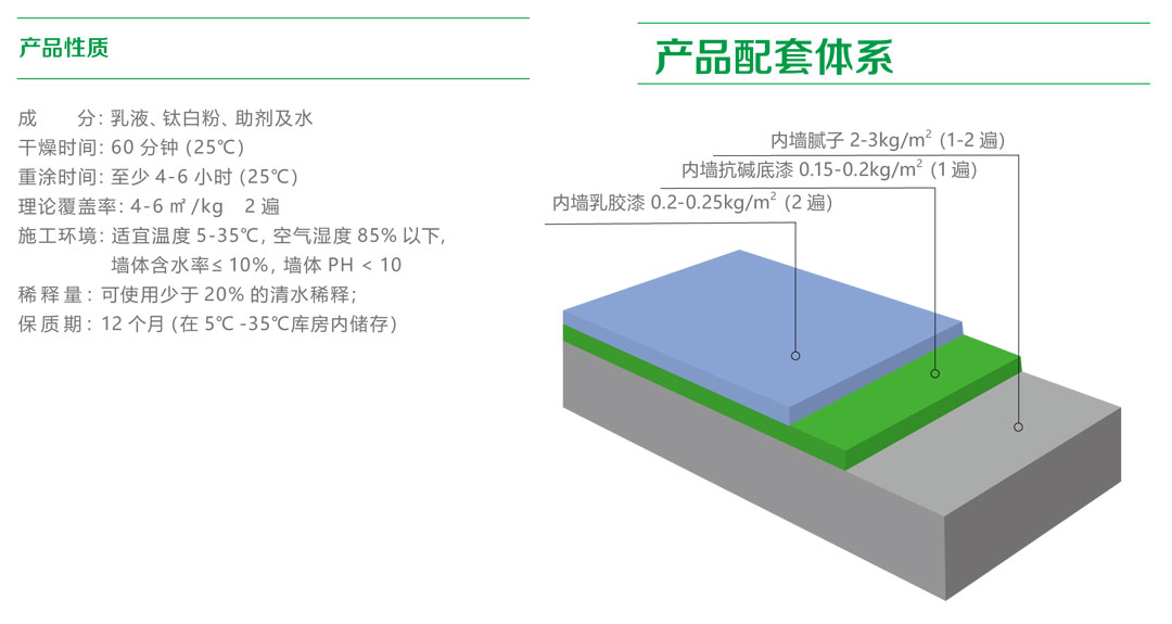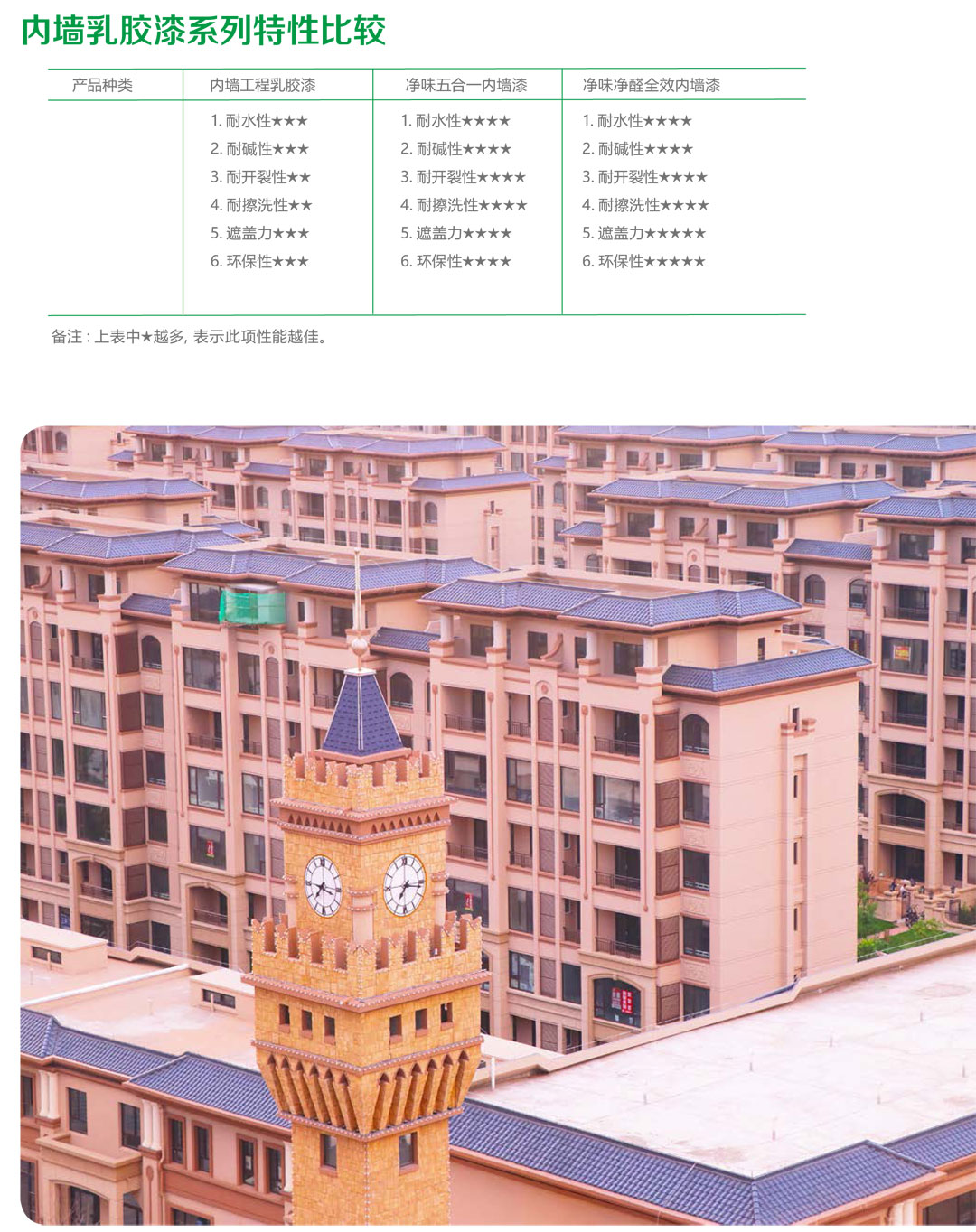 采用特別研發配方的健康環保型內墻乳膠漆,該產品易施工,耐臟易擦,防霉抗菌,適用于大眾建筑的內墻及各種柱、欄桿等裝飾造型,該產品健康環保,其揮發性有機化合物 VOC 含量遠低于國家頒布的相關標準。