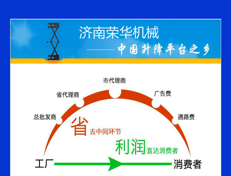 •      濟南榮華機械設備有限公司是一家集研發、設計、和銷售于一體的制造型企業,專業制造升降平臺、液壓升降機械、鋁合金升降平臺,登車橋等,曲臂式升降機,高空作業平臺,技術力量雄厚,工藝先進合理,檢測手段齊全。