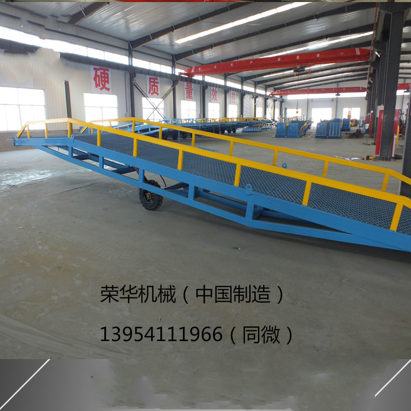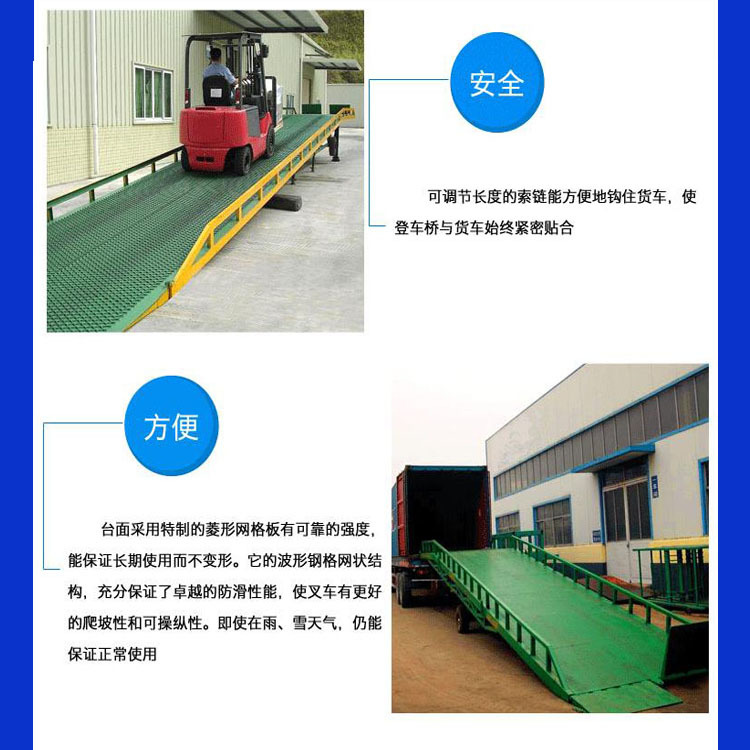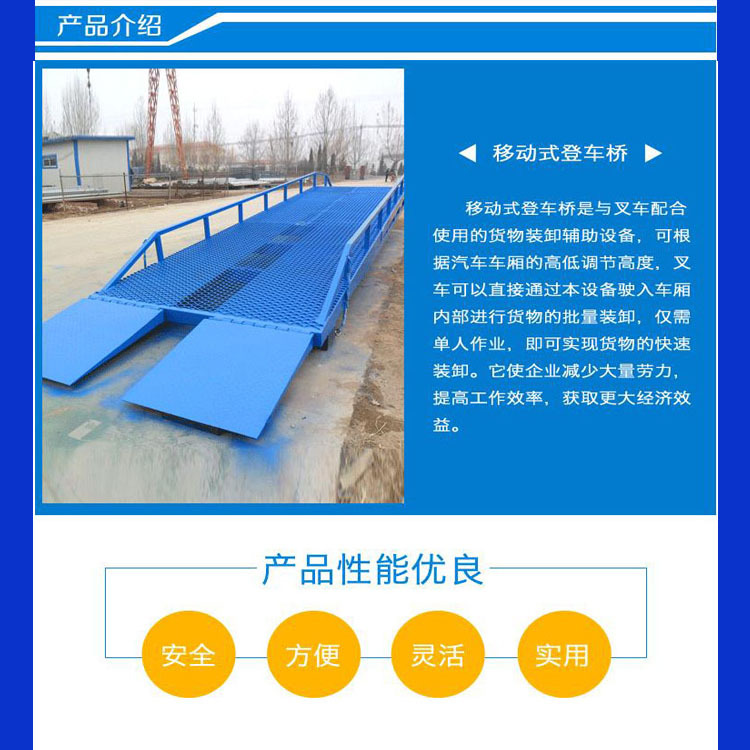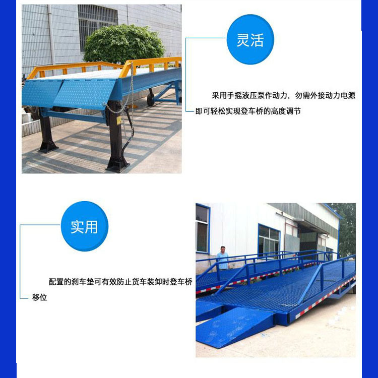 移動式登車橋應用于無裝卸站臺或裝卸位置不固定以及裝卸場地狹小等場合,實現了貨物快速裝卸。通過它使叉車等搬運車輛直接進入貨車、集裝箱、列車車廂裝卸貨物,大大的提高了工效。登車橋采用手動液壓操縱,無需其它動力,能適用于各種裝卸場合;登車橋采用支腿支撐和網格狀鋼板結構,有更可靠的安全性能。